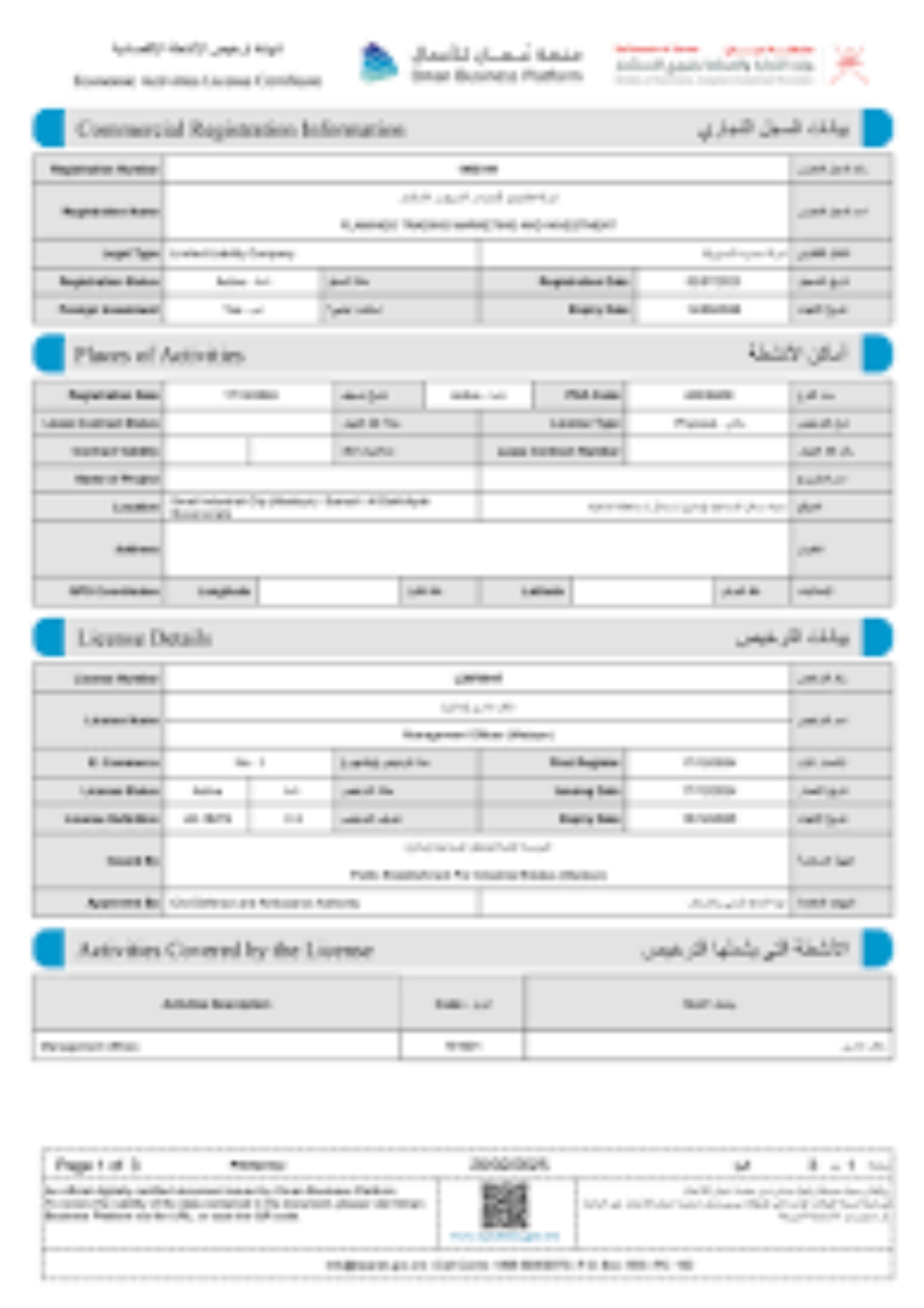 Permit certificate authorizing foreign investors to legally operate in Oman