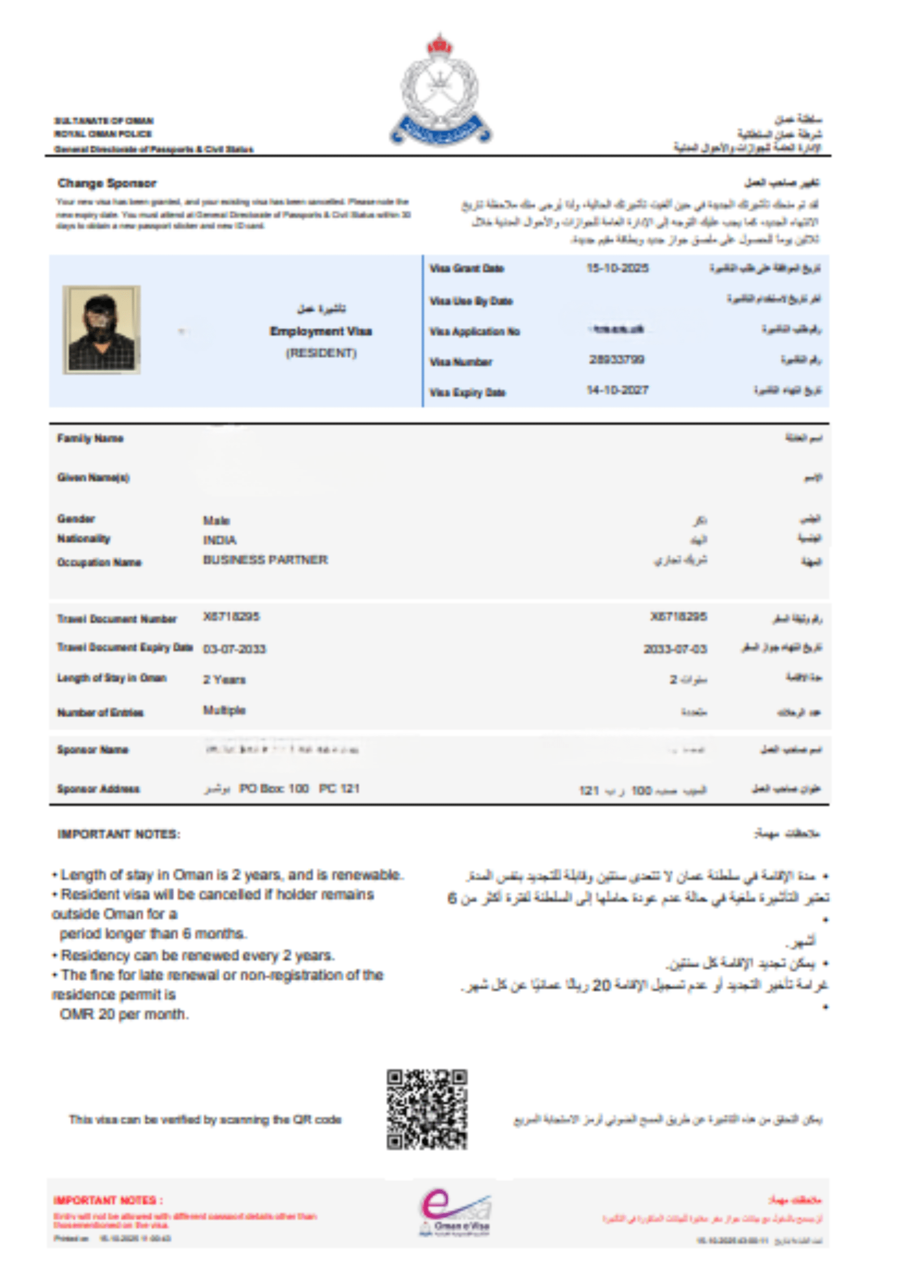 Royal Oman Police residency ID card for the investor and family members